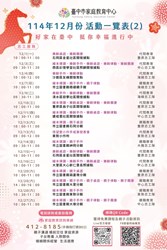 387040100E_1140003294_ATTACH1 (1) 1.臺中市家庭教育中心檢送114年12月份活動一覽表 2.臺中市家庭教育中心臉書粉絲頁貼文(網址:https://reurl.cc/XaE9NE )