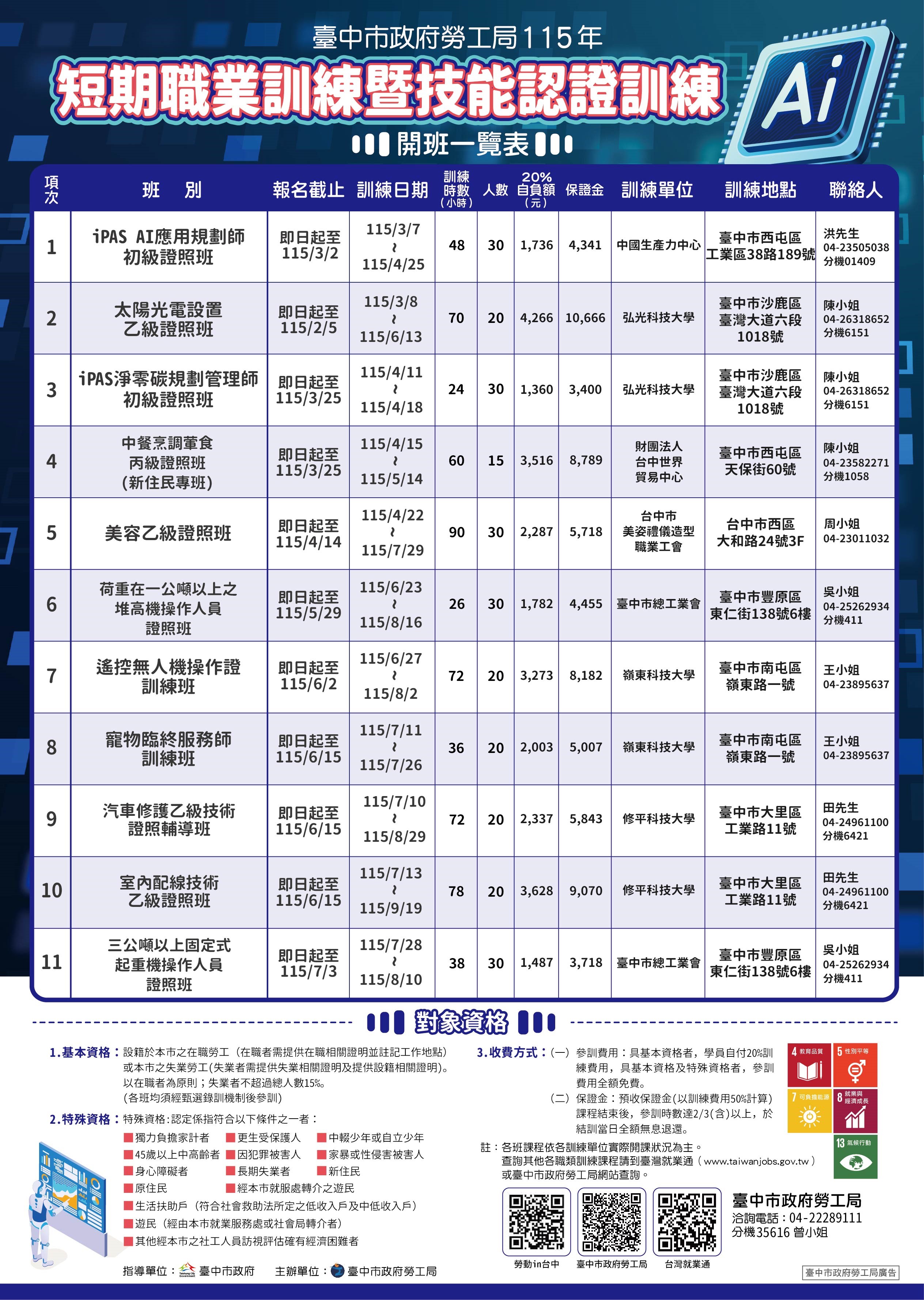 臺中市政府勞工局辦理115年短期職業訓練暨技能認證訓練