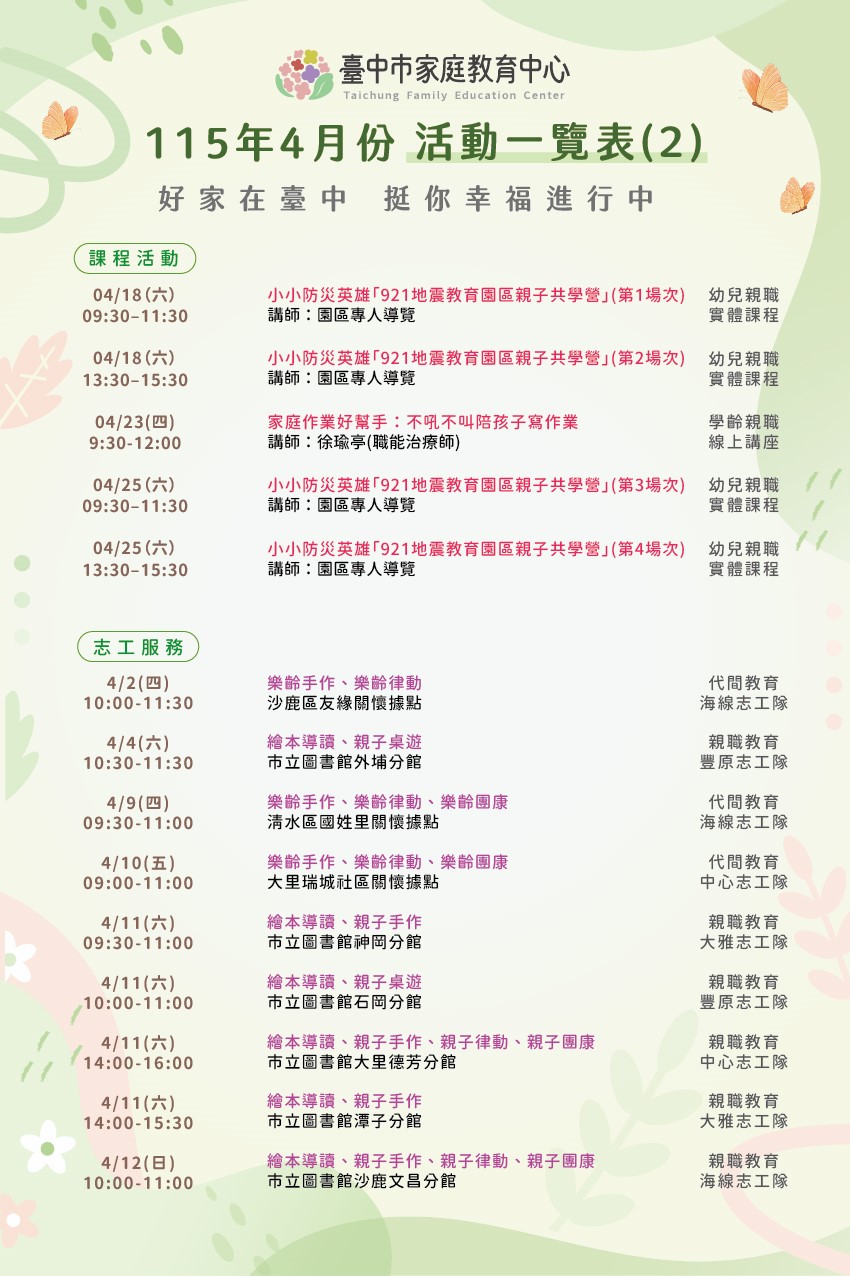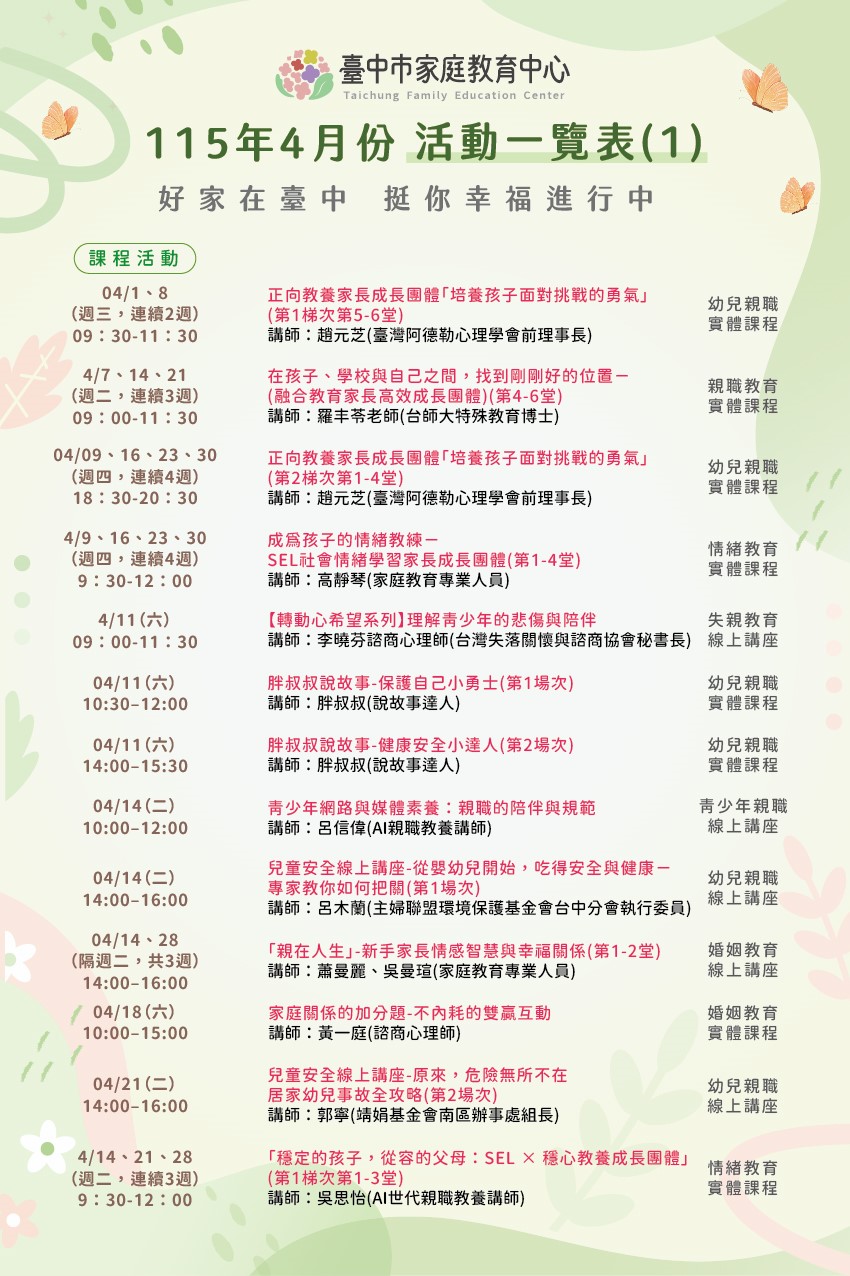 1.臺中市家庭教育中心【115年4月份活動一覽表】。